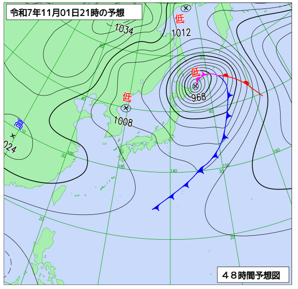 【大雨情報】24時間で“台風並み”にまで発達か1010hPa→968hPaに… “爆弾低気圧”が本州の太平洋側を北上へ 気象庁が「全般気象情報」を発表中 今後の天気は?【雨風シミュレーション】 青森テレビ 2025年10月31日(金) 15:15 国内 【天気図(最新・24時間・48時間予想図あり)】 気象庁HPより(10月31日午後2時半現在) 気象庁HPより 気象庁HPより 気象庁HPより