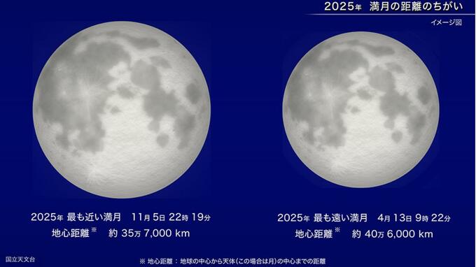 月が地球に最も近づく「近地点」を通過するのは、日付が変わった6日(木)の7時27分。満月になるタイミングと、地球への最接近のタイミングが非常に近いため、5日の夜は「スーパームーン」を観測する絶好のチャンスとなります。