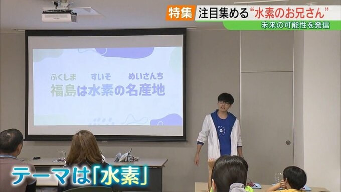 テーマは「水素」。地球温暖化の原因となる二酸化炭素を使用時に排出しない「次世代のエネルギー」として注目されています。福島県内でも燃料電池自動車向けの水素ステーションを各地に設置するなど、取り組みを強化しています。水素の元素記号=「H」がデザインされた服装のこちらの男性は…。