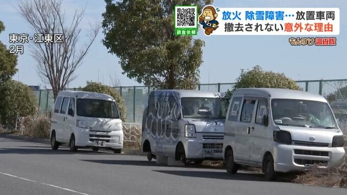 今年2月、東京では、驚くような光景が…。江東区新木場の道路には、30台を超える放置車両が―。まるで“車の墓場”のような有りさまだ。