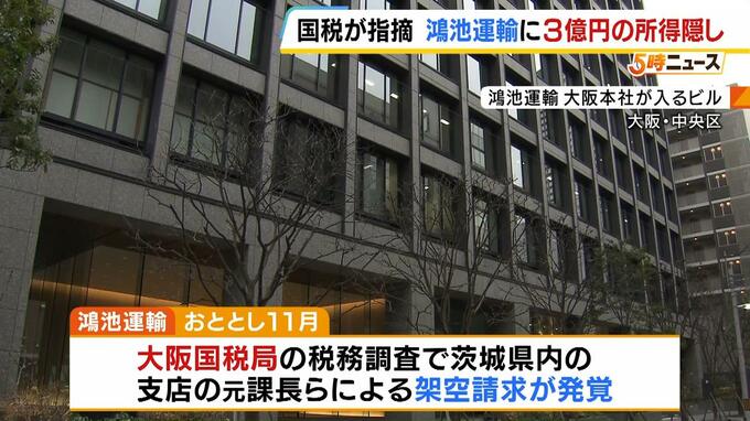 物流大手「鴻池運輸」について、大阪国税局が約3億円の所得隠しを指摘していたことが分かりました。 大阪市に本社を置く「鴻池運輸」をめぐっては、2023年11月、大阪国税局の税務調査で茨城県内の支店の元…