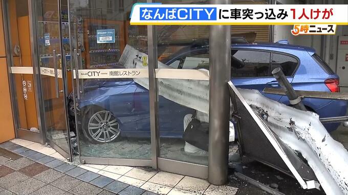 大阪・なんばの商業施設の入り口に、60代の女性が運転する車が突っ込み、近くにいた男性が巻き込まれてケガをしました。 ガードレールを押し倒し、ガラス扉を突き破って停車した青の乗用車。 事故が起きたのは…
