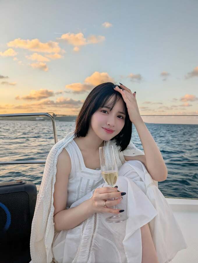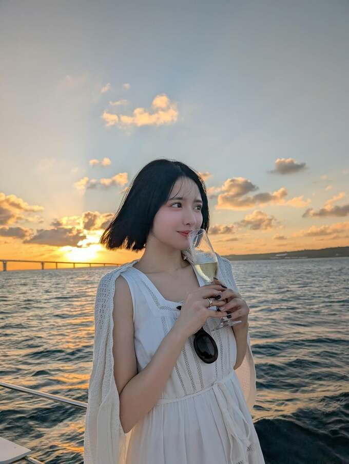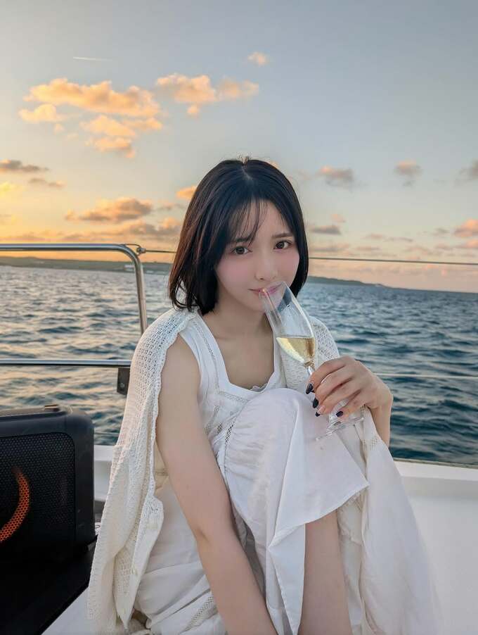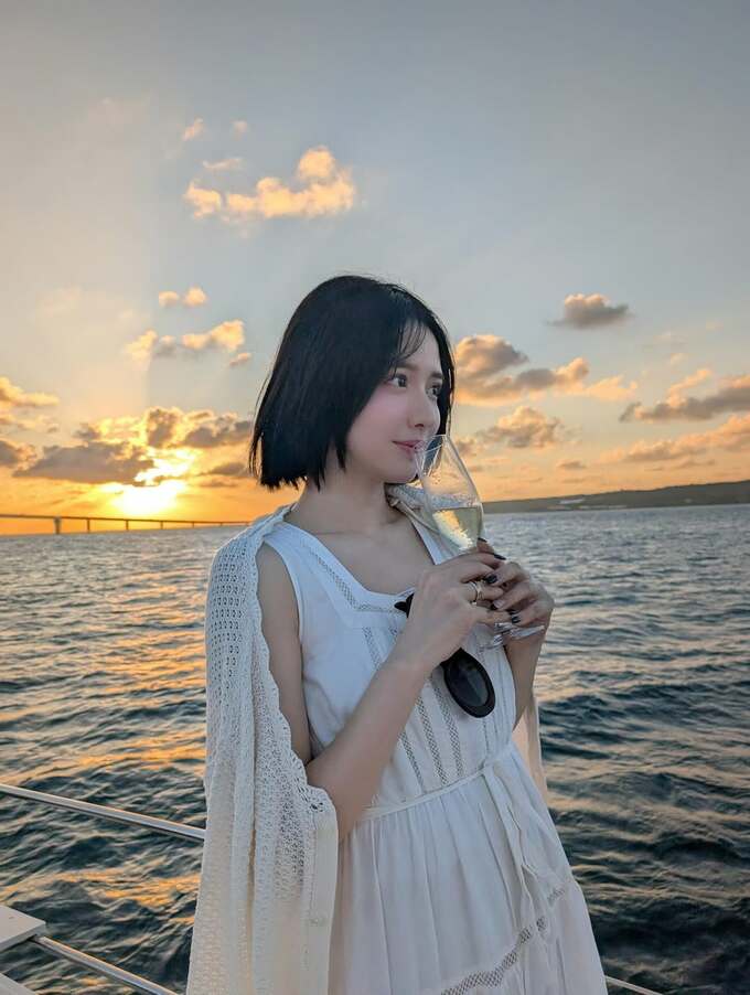 白いノースリーブのワンピースにレースのカーディガンを羽織った姿で船上に座る鎮西さんは、オレンジ色の夕日に染まる海をバックに、グラスを手に優しく微笑んでいます。
