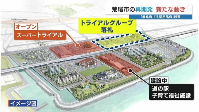 再開発計画のイメージ図。すでにオープンしているスーパーの隣の区画を、トライアルグループが落札したのです。