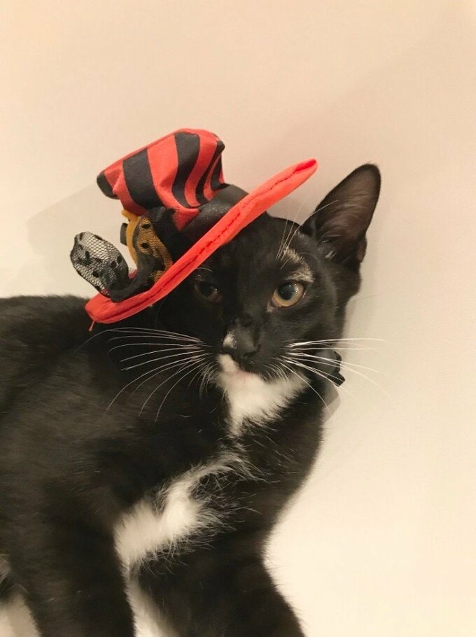 その帽子は赤と黒の縞模様でつばが大きく、網生地のリボンが付いていて、夜向きの大人な雰囲気を漂わせています。そしてマル自身も黒の多い模様で、まるで紳士の夜会服のよう。藤さんは一瞬の隙を狙ってマルに帽子をかぶせ撮影したようで、マルの表情は期せずして “キリっ” とした目つきになっています。