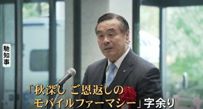 馳浩知事「秋深し・ご恩返しの・モバイルファーマシー。いざという時に誰かがどこかに応援に行ける、そのご恩返しをできるようにしよう」