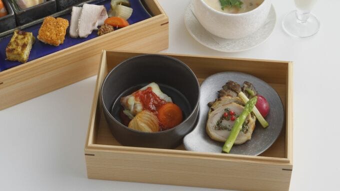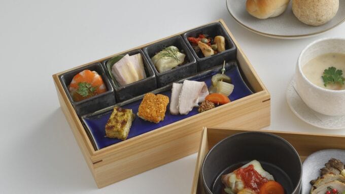 こちらは、1号車と2号車で提供される「フレンチ膳」。三重県産の食材をふんだんに使った、彩りあるフレンチを木箱に詰め込んだもので、近鉄・都ホテルズが監修します。