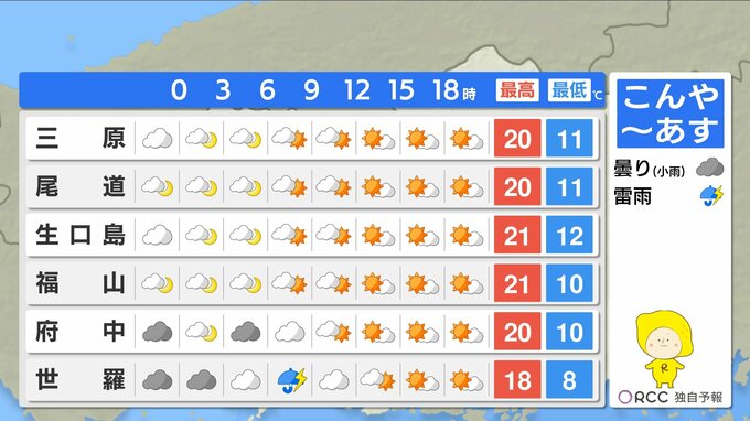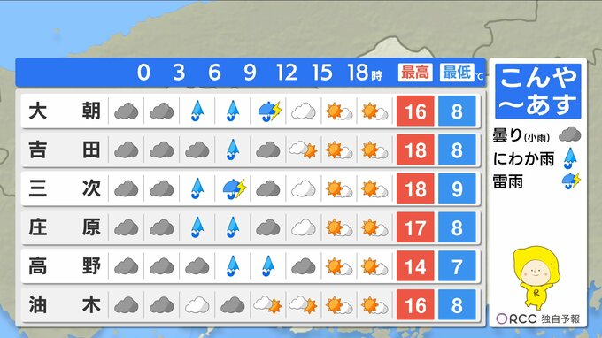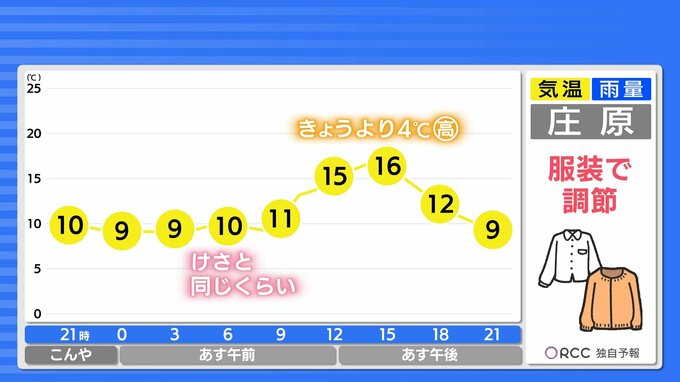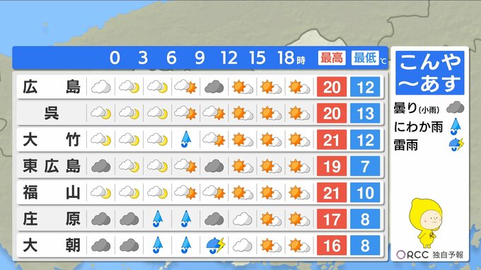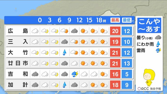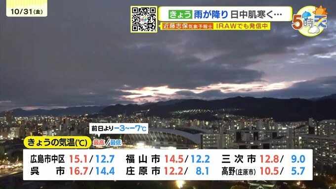 きょう31日(金)の広島県内は、朝から雨が降り、肌寒い1日となりました。最高気温は、広島市中区で15.1℃、福山市で14.5℃、庄原市で12.2℃、きのうとくらべると3~7℃低くなっています。