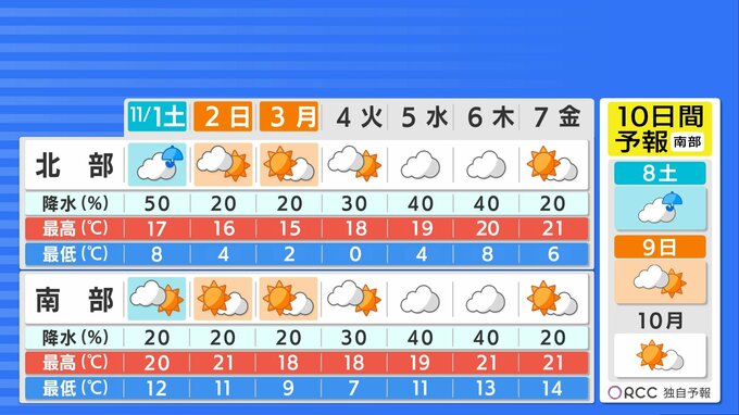 日差しは来週火曜まで届く見込みです。水曜と木曜は、低気圧や前線の影響を受けて、ぐずつくでしょう。来週は、1日の気温差も大きく予想です。体調管理にはご注意ください。