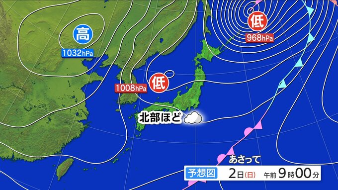 あさって2日(日)は、日本海に低気圧が発生し、北部ほど雲が多い予想ですが、各地で日差しが届くでしょう。3日(月・祝)にかけて晴れますが、この2日間も、寒気が入るタイミングで雨が降る時間もありそうです。