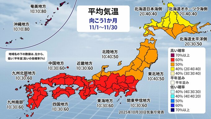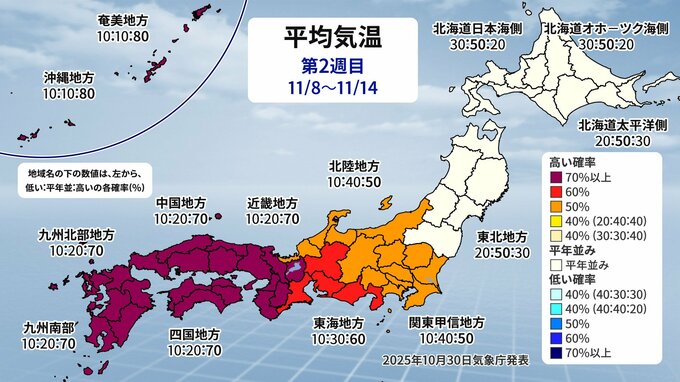 1週目(11月1日~7日)は、奄美・沖縄と北日本で平年よりも気温が高い見込みです。10月下旬に急に雪が降るような寒さになった北海道も、一旦季節は足踏みします。