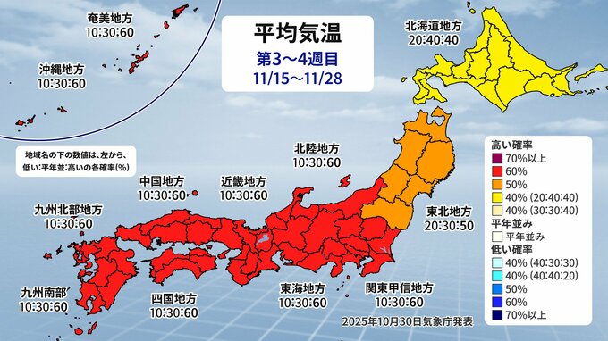 3~4週目(11月15日~28日)は、北日本への寒気の流れ込みが弱まるでしょう。西日本・東日本は引き続き高温傾向で、北日本は平年並みか高い見込みです。