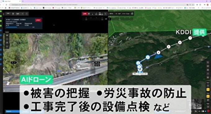 遠隔操作が可能なAIドローンを使っていち早く現場に到着し、搭載されたカメラで被害状況の把握をはじめ、土砂の堆積量の解析や現場での労災事故防止、工事完了後の設備点検などに役立つことが期待されます。