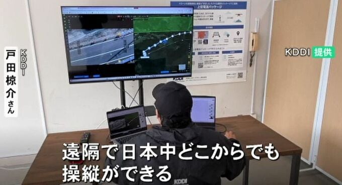 KDDI 戸田椋介さん「今までは機体とパイロットが現地に行かなければドローンの操縦というのは出来ませんでした。この機体は我々のモバイル通信と組み合わせる事によって遠隔で日本中どこからでも操縦ができる」
