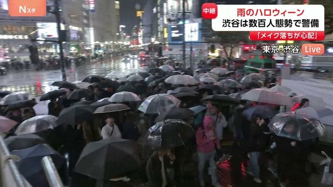 ハロウィーン当日の夜となりました。あいにくの雨となっていますが、東京・渋谷駅前の現在の様子をお伝えします。仮装している人はチラホラといる程度ですが、皆さん傘をさしているので、人の数以上に混雑して見え…