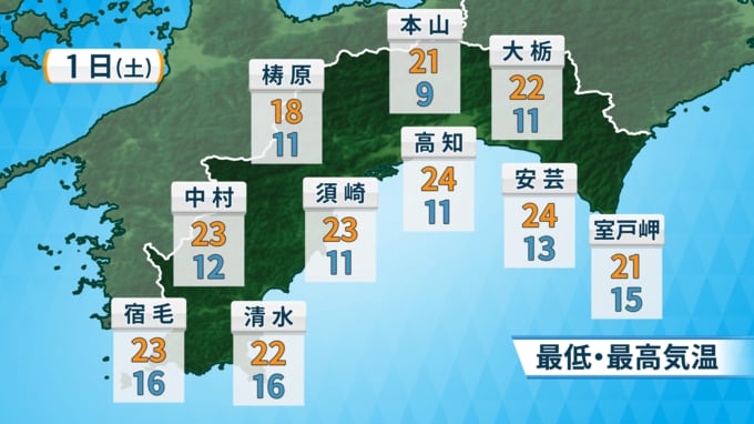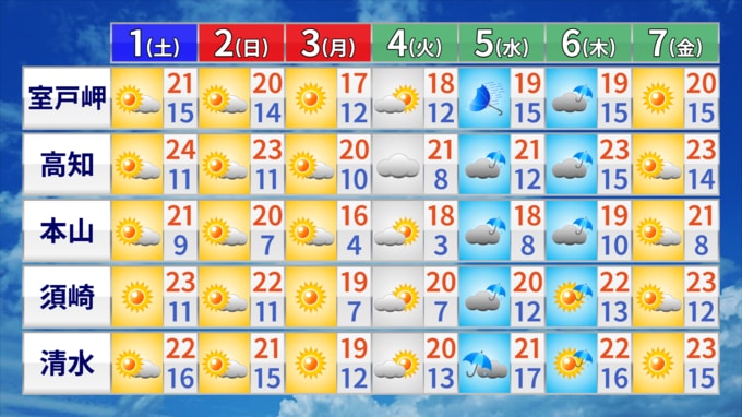 11月1日の高知県内は、高気圧に覆われて概ね晴れる見込みです。午後になると雲が少なく、よりすっきりとした空模様となるでしょう。