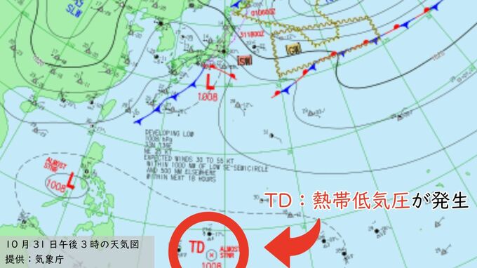 気象庁の予想天気図によりますと、きょう(31日)午後3時の天気図で、カロリン諸島に“台風のたまご”=「熱帯低気圧」が発生しました【画像①】。