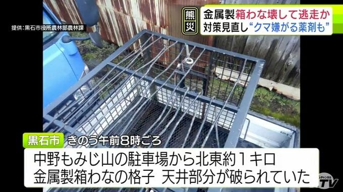 黒石市によりますと、30日午前8時ごろ、市の職員が中野もみじ山の駐車場となっている「やすらぎの駐車帯」から北東に約1kmの所に設置された金属製の「箱わな」を確認したところ、格子の天井部分が破られていたということです。「わな」は一般的な強度の基準を満たしていましたが、破損が確認されました。