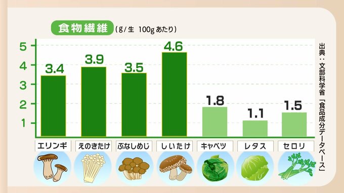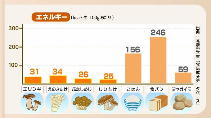 同じ100グラムで比較すると、食パンは246キロカロリー、ご飯は156キロカロリーなのに対し、キノコ類は25~34キロカロリーと低カロリー。