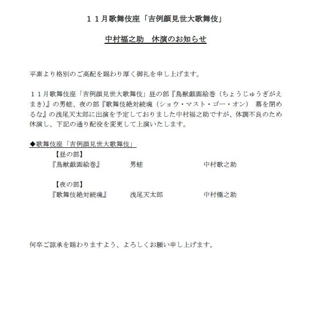 「11月歌舞伎座『吉例顔見世大歌舞伎』昼の部『鳥獣戯画絵巻(ちょうじゅうぎがえまき)』の男蛙、夜の部『歌舞伎絶対続魂(ショウ・マスト・ゴー・オン) 幕を閉めるな』の浅尾天太郎に出演を予定しておりました中村福之助ですが、体調不良のため休演し」と公表しました。