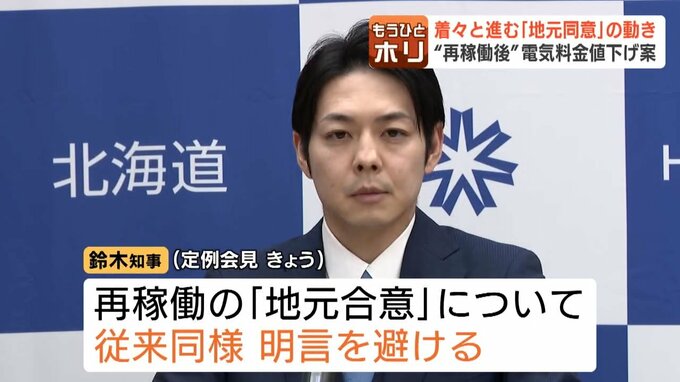 「電気料金が全国的にも高い水準に北海道はある。道民の生活・道内経済にも大きな影響を与えている。再稼働については道議会・関係自治体・道民の声。道民の声にも様々ある。そういったことも踏まえて総合的に私としては判断したい」