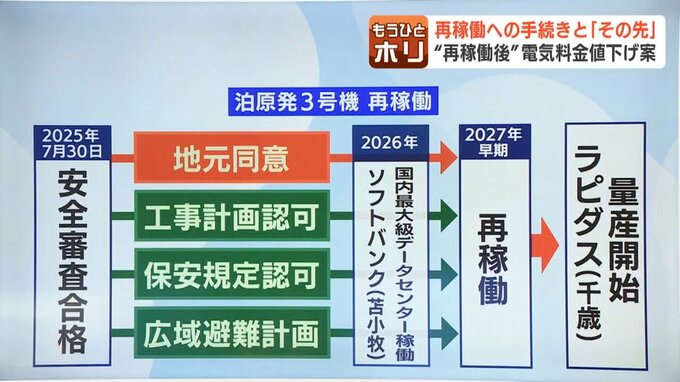 北電は、「地元同意」に加え、規定の認可や避難計画などを踏まえて2027年の早い時期に再稼働したいとしています。