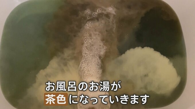 1年ほど前に配管を掃除したということですが、追い焚き機能を使いながら薬剤を入れていくと湯船のお湯が一気に茶色くなりました。
