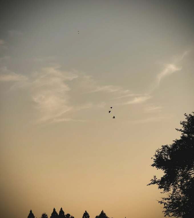 夕暮れ時の空を背景にした写真も複数あり、橙色のグラデーションが広がる空に木々のシルエットが浮かぶ風景が印象的です。