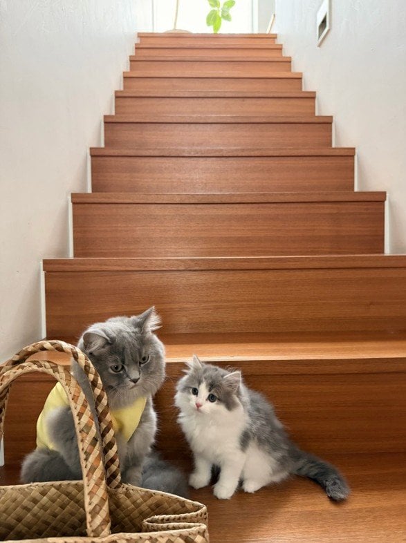 高橋さんは「おはようございます」と題して、自宅の階段の下に身を寄せ合って佇むミルリィとラヴィの姿を投稿。ミルリィは避妊手術を終えた後ということで、黄色い保護ベストを着ています。