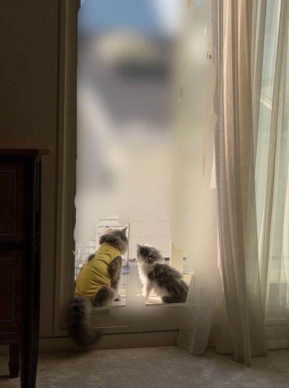 続く投稿で高橋さんは「撮り溜めた写真のどれからアップしたらいいかわからなくなり」「とりあえず可愛い2人には和ませてもらってます」と、ミルリィとラヴィが隣同士に座る後ろ姿の写真や、窓際のミルリィを背にしたラヴィが腹ばいになってこちらを見ながら「にゃ~~~」とひと声鳴いている写真を投稿。仲の良い様子が伝わってきます。