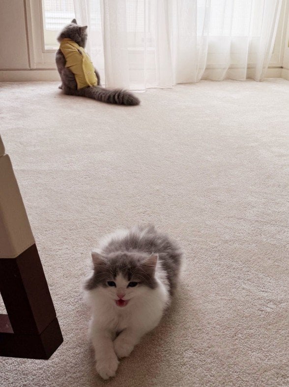 さらに続く投稿で、ラヴィがこちらを向いている写真を投稿。「いつもミーちゃん優先でめちゃ可愛がっているんですが、」と言いつつも、高橋さんは「赤ちゃんは可愛いものは可愛いので、ちゃんと周りをチェックして」「ヨシヨシしていたら」「後ろで気配が…」とのこと。