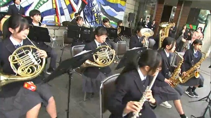 岡山中央中学校吹奏楽部による演奏で開幕した「秋のtenjinふれあいまつり」は、地域の伝統文化をつなぎながらにぎわいを作り出す場として能楽堂ホールを開放して開いているものです。