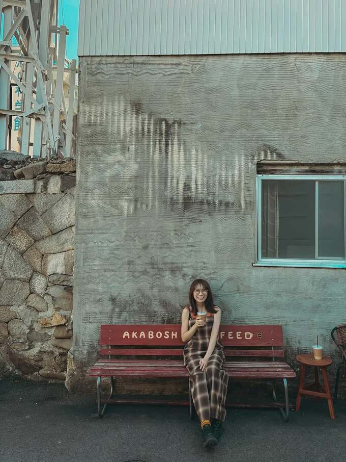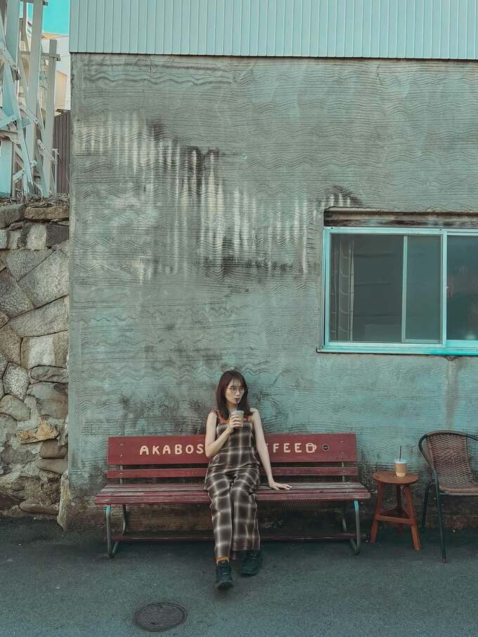 投稿された画像で、秋元さんはメガネをかけ、茶色いチェックのキャミソールサロペットを着用し、ドリンクを手に赤いベンチに座っている様子が写っています。