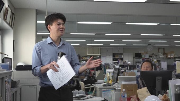 先輩アナウンサーの丸山丈瑠がアナウンス部に立ち寄った。彼はこの日、高校駅伝で初めてのスポーツ実況(中継所担当)に臨んでいた。