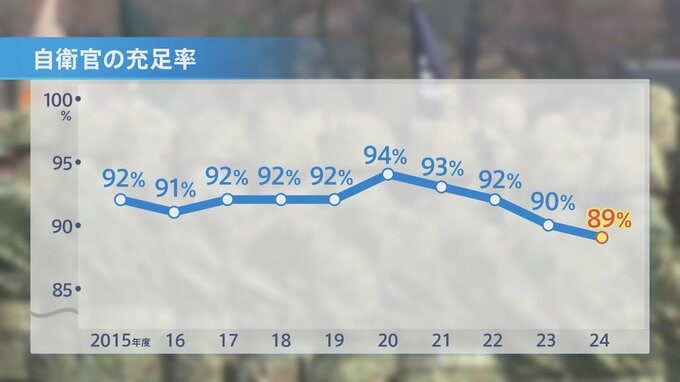 自衛隊の人手不足は深刻だ。自衛官の人数は長年定員に達せず、2024年には充足率が25年ぶりに90%を割り込んだ。