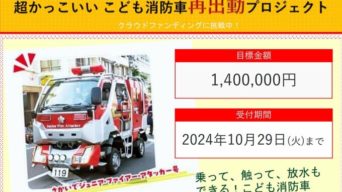 お隣香川県の坂出市が「こども消防車(正式名称・さかいでジュニア・ファイアー・アタッカー号)」の修理費用を募るクラウドファンディングを行っていて、その目標金額を達成したといった話題に触れたとき、ふと、そんな古い記憶がよみがえったのだ。