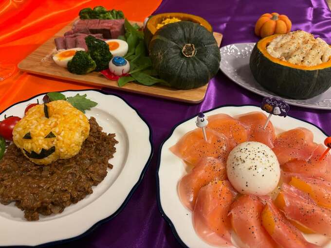 2枚目にはジャック・オ・ランタンをかたどったサフランライスのキーマカレーやカボチャの中に仕込んだグラタン、そして生ハム&モッツァレラチーズやローストビーフなど、ごちそうがぎっしり並ぶ写真を投稿しています。