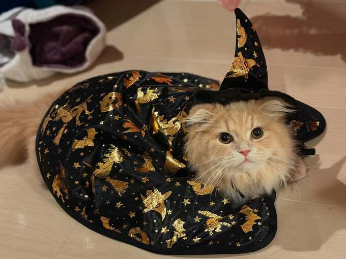 高城さんは「Happy Halloween」「お菓子ちょーだい」と絵文字と共にテキスト。1枚目に愛猫のダブルゼータくんの魔法使いコスプレを投稿。黒の尖ったツバ広帽子と丸く広がるマントを纏い、キリッとした目でこちらを見つめています。