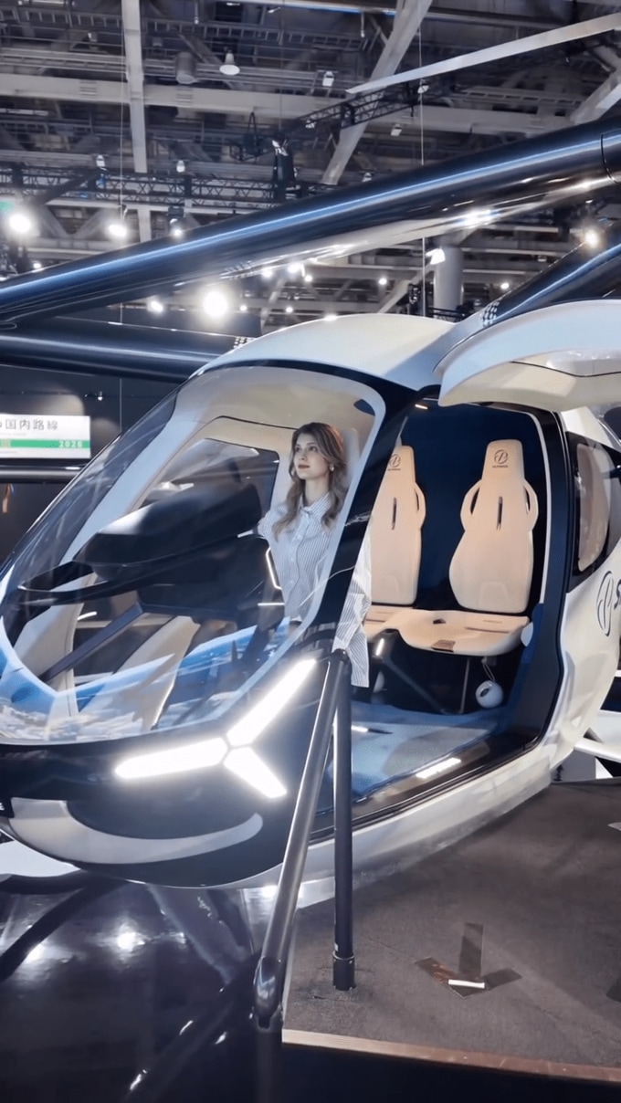 そして「中でもやっぱり気になるのは…空飛ぶクルマ」というマギーさんは、早速そのコクピットに座って、その気分を味わっていました。