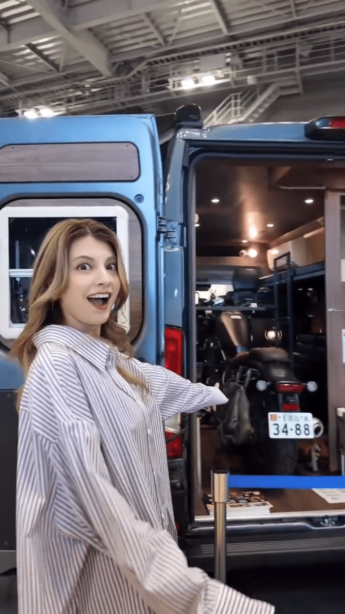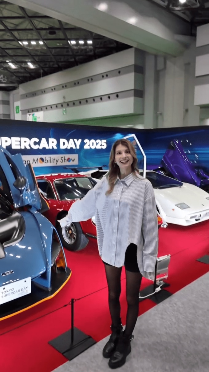 「1970年前後の歴代の名車から、最新のキャンピングカー、そして各メーカーが描く“未来のモビリティ”まで」というマギーさんは、フェラーリやランボルギーニなどが並ぶ「スーパーカー」のブースや、HONDA・KAWASAKI・MITSUBISHI・NISSANといった日本メーカーのブースにも来訪。