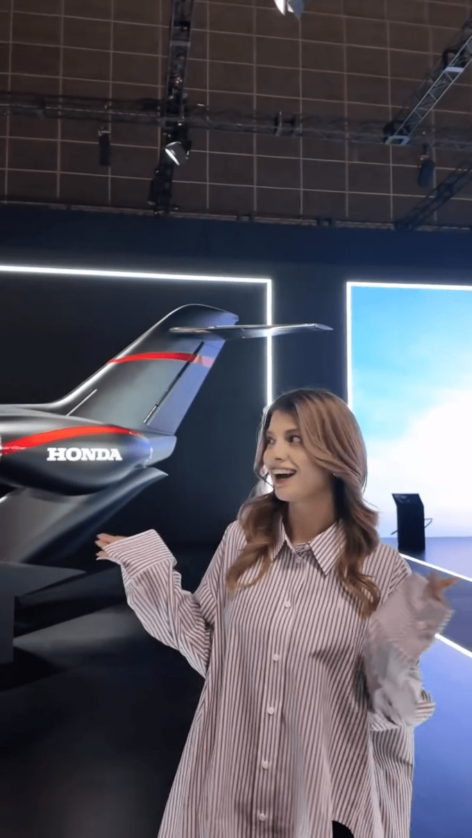 マギーさんは会場のゲート前から笑顔で入場。往年の名車から最新のコンセプトカーまでが並ぶ会場を軽やかに駆けめぐり、各ブースの前で展示を見ては驚きや興奮の表情をみせています。