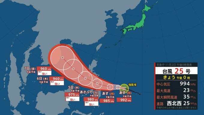 台風25号は、きょう(2日)正午にはフィリピンの東にあって、1時間に25キロの速さで西北西に進んでいます。中心気圧は994ヘクトパスカル、中心付近の最大風速は23メートル、最大瞬間風速は35メートルとなっています。