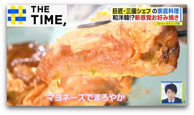 〔4〕キムチ+マヨネーズで「韓国風ソース」、お好みソース+粒マスタード(カラシでもOK)で「フレンチ風ソース」を作り、焼きあがった生地に半々ずつかけたら完成