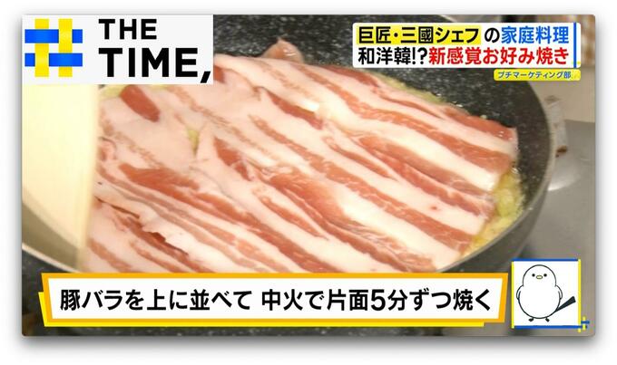 〔3〕油が残ったフライパンに生地を広げ、豚バラをON。中火で片面5分ずつ焼く