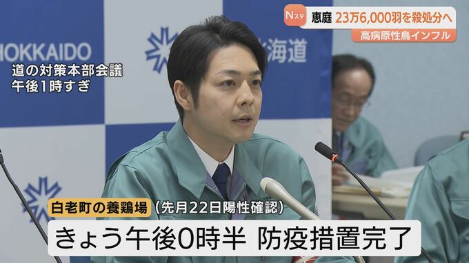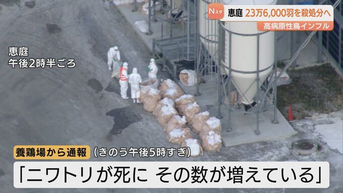 北海道恵庭市の養鶏場で死んだニワトリが2日、高病原性鳥インフルエンザの陽性と確認され、およそ23万6000羽の殺処分が始まりました。
