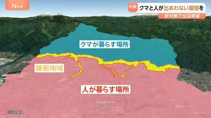 町が6月に始めたのが、「ゾーニング」という対策。「クマが暮らす場所」「人が暮らす場所」とエリアを分類。その中間地点を「緩衝地域」とします。