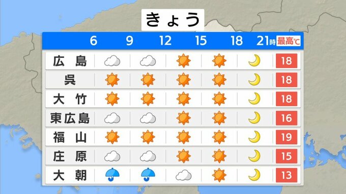 最低気温は、広島市中区11.9℃・庄原市6.0℃・神石高原町油木4.1℃など、先週より冷え込みが弱まり氷点下を観測した地点はありませんでした。