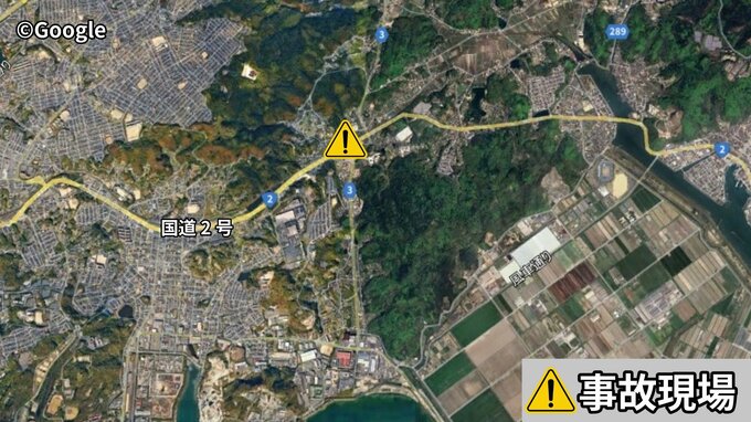 この事故の影響で、国道2号の下りは左折レーンと2車線のうち1車線を規制しています。