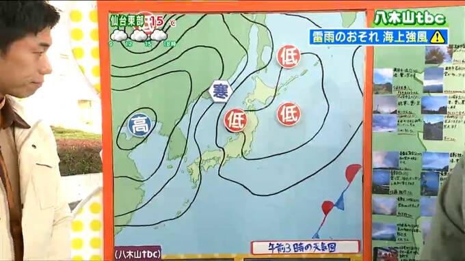 午前3時の天気図では、秋田沖のあたりに低気圧があり、上空に強い寒気を伴っています。これが東北地方に進んでくる見込みで、宮城県内も晴れ間は出ますが、この低気圧の影響で日中は雲が広がりやすく、西部を中心に雨が降り、局地的に雷雨となるおそれもあります。