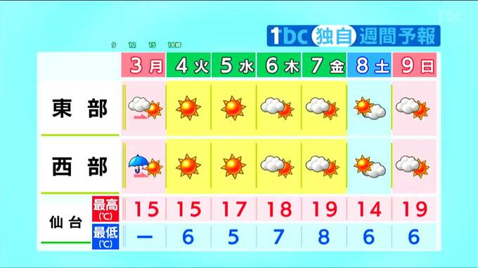 気温については、寒気の影響で晴れ間が出てもあまり上がらない予想です。仙台市内では、夕方にかけて雲が広がりやすく、西部を中心に雨の予想です。東部にも雨雲が流れ込む可能性があるため、外出時は雨具をお持ちください。夜はよく晴れそうです。あす4日、あさって5日は高気圧に覆われてすっきり晴れそうです。